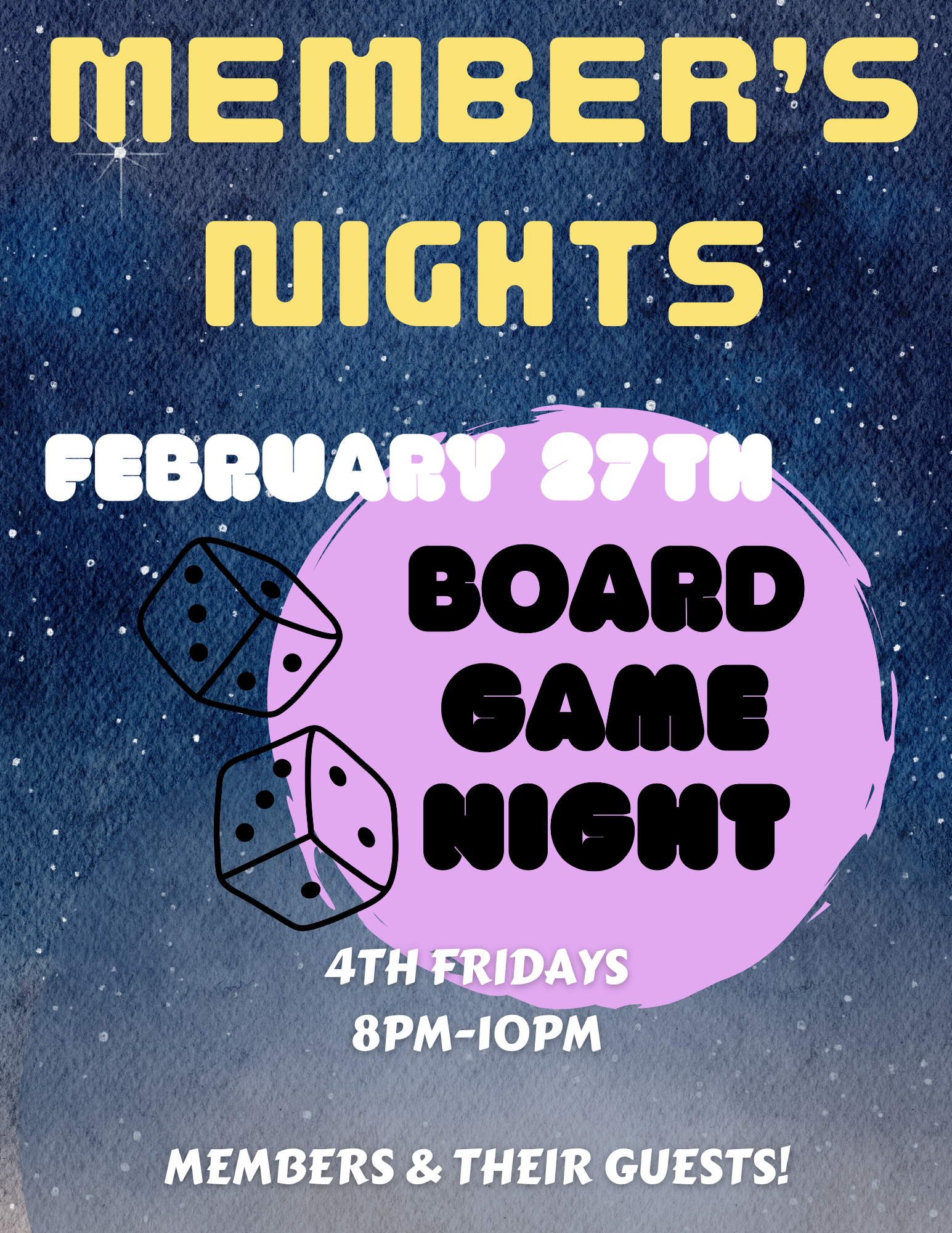 For our first member's night, we're doing board games! Bring your favorite board game & your best friend. We'd love to see you there!